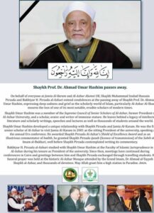 وقال نائب رئيس جامعة الكرم الإسلامية في بريطانيا، انه سيتم ترجمة كتب لفضيلة الإمام لنشرها ببريطانيا للجالية الاسلاميه، رحم الله فضيلة الامام الدكتور أحمد عمر هاشم، الذي عم عطائه العلمي جميع أنحاء العالم وتم أداء صلاة الغائب على فضيلته بالكثير من دول العالم الإسلامية، منها ماليزيا وإندونيسيا ودول أفريقيا الاسلاميه، وامام الحرم النبوي نظم ابيات شعريه في رثائه، وتم ارسال قطعة من كسوة الكعبه ليتكفن بها، مكتوب عليها سورة ياسين كامله، نساءل الله تعالى أن يعوض الإسلام والمسلمين والازهر الشريف عن فقيدهم الكبير امام السنة أحمد عمر هاشم.